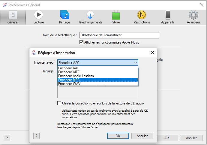 5. Cochez la case à côté de Utiliser la correction d'erreur lors de la lecture de CD audio, puis cliquez sur OK pour confirmer et attendez que la musique du CD soit importée dans la bibliothèque iTunes.