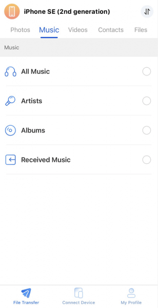 Étape 3. Sur l'iPhone A, appuyez sur File Transfer > Choisissez Music > Sélectionnez la musique que vous souhaitez transférer > Appuyez sur Send pour commencer le transfert.