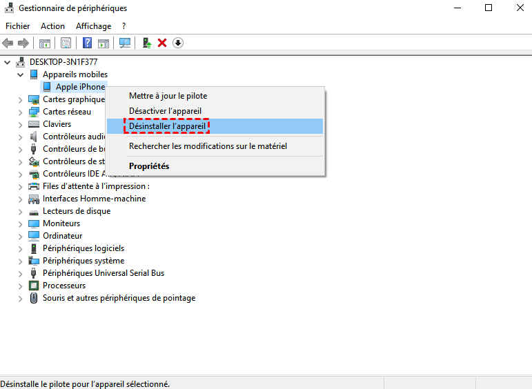 Étape 2. Sélectionnez Gestionnaire de périphériques > Apple iPhone > cliquez avec le bouton droit de la souris sur votre iPhone > Désinstaller l'appareil.