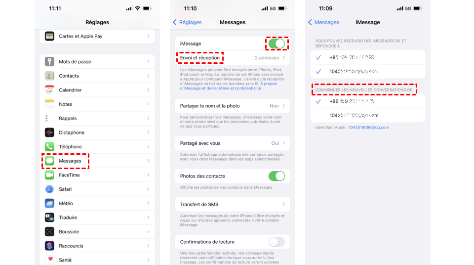 Étape 2. Appuyez sur l'option Envoi et réception > Assurez-vous que l'identifiant Apple utilisé pour iMessage est correct > Confirmez le numéro de téléphone et l'adresse e-mail pour envoyer/recevoir des messages.