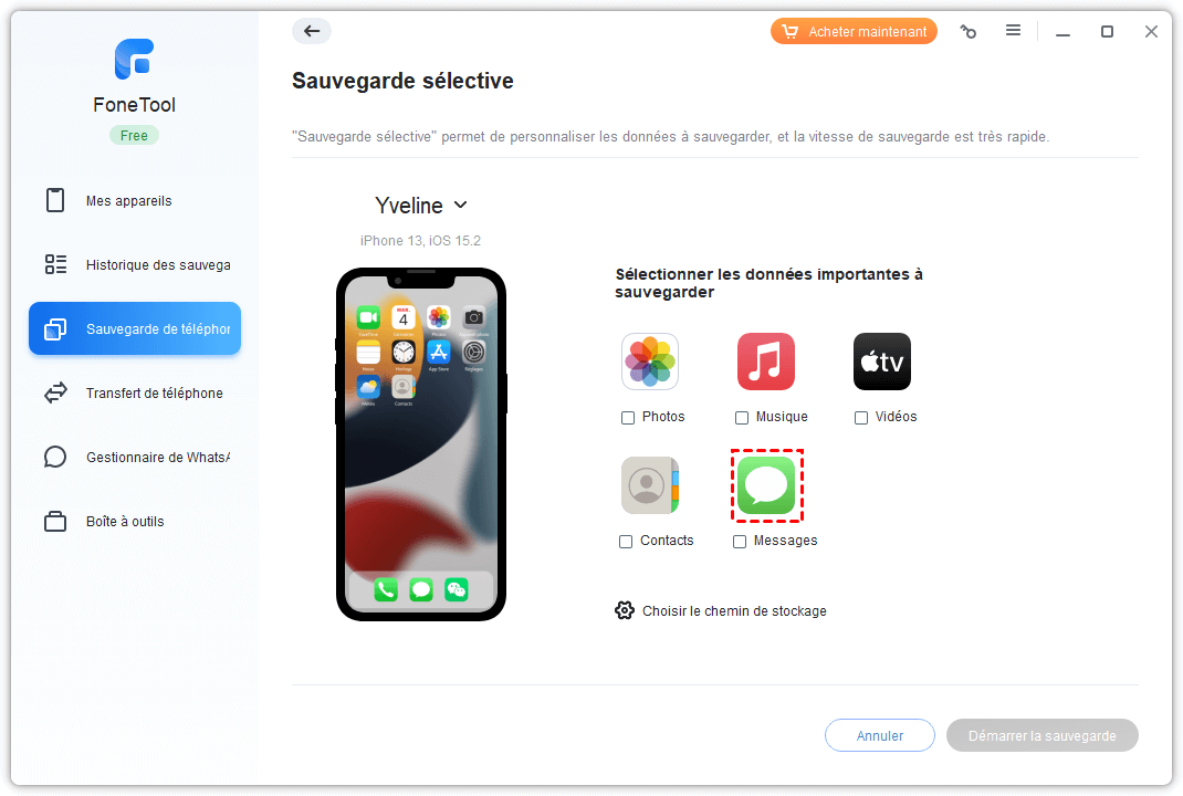 Maintenant, téléchargez gratuitement FoneTool sur votre ordinateur et suivez deux étapes pour effectuer le transfert : 1. Sauvegarder les messages sur l'iPhone A → 2. Restaurer les fichiers de sauvegarde sur l'iPhone B.