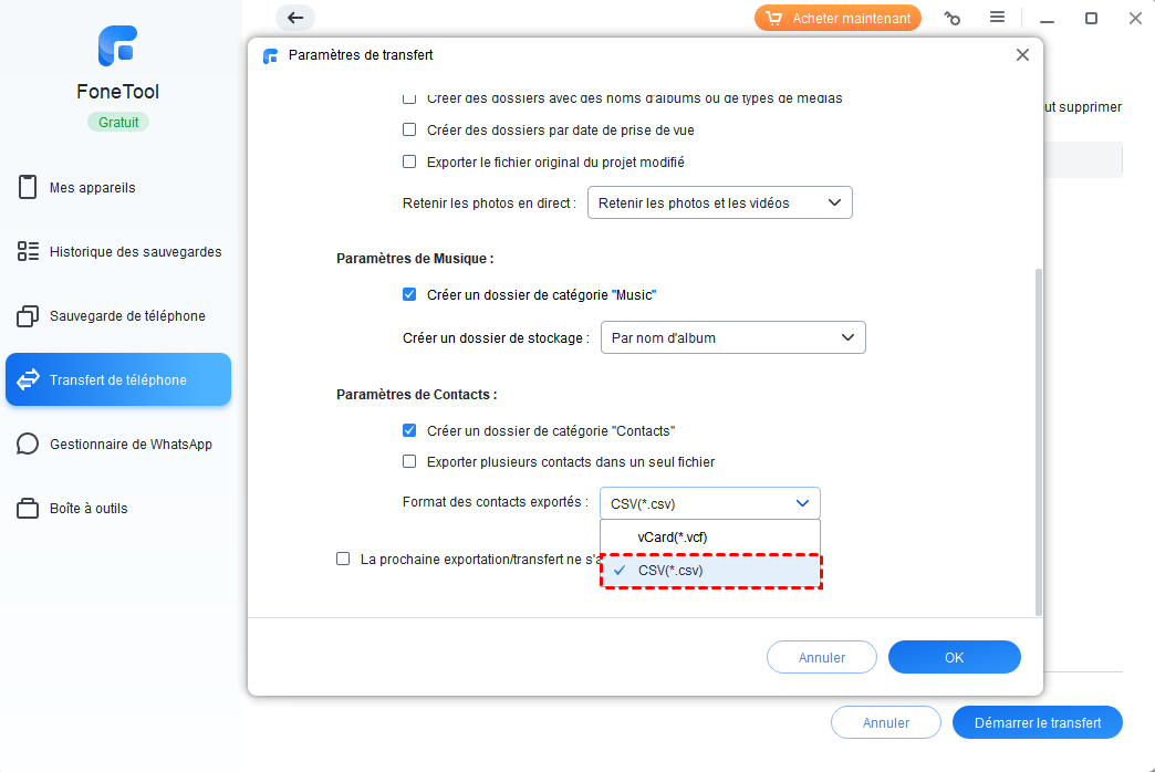 Étape 3. Sélectionnez CSV comme type de fichier à exporter. Vous pouvez également choisir un chemin de stockage pour enregistrer les contacts. Cliquez ensuite sur Démarrer le transfert. Attendez ensuite que le processus soit terminé.