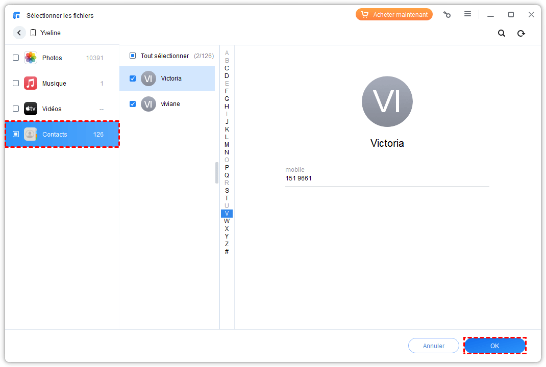 Étape 2. Cliquez sur l'icône + pour sélectionner un contact. Ici, vous pouvez sélectionner des éléments spécifiques. Cliquez ensuite sur OK.