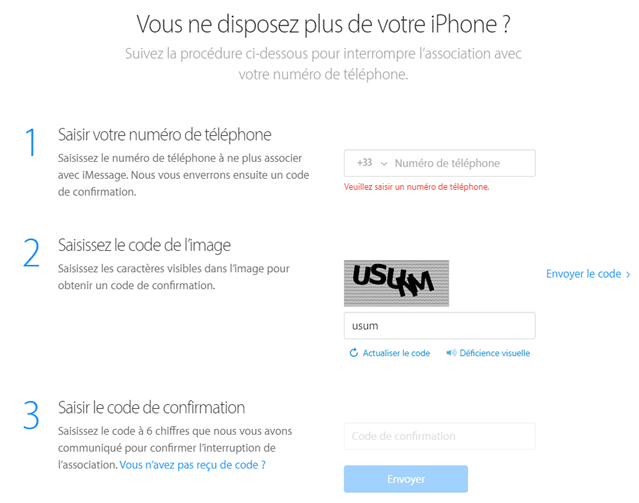 1. Accédez à la page dédiée Désactiver iMessage (https://selfsolve.apple.com/deregister-imessage/fr/fr).