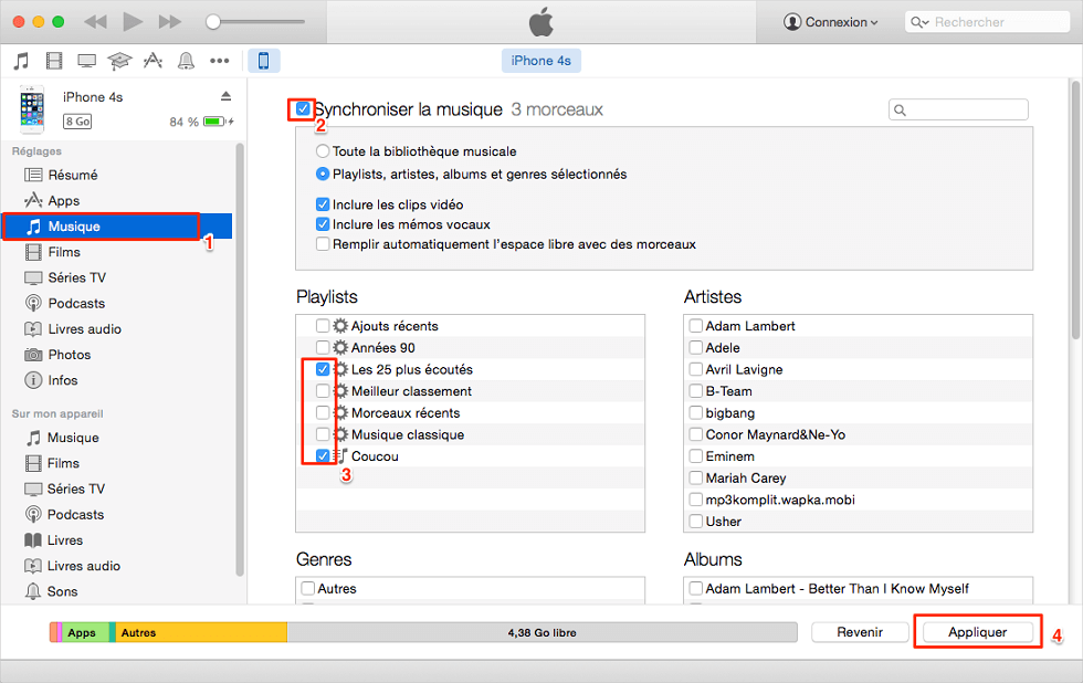 >> Synchroniser la musique : Cliquez sur Fichier > Choisissez Ajouter un dossier à la bibliothèque > Parcourez votre ordinateur et sélectionnez le dossier contenant la musique que vous souhaitez transférer dans la bibliothèque iTunes > Cliquez sur l'onglet Appareil > Choisissez Musique > Cliquez sur Synchroniser la musique > Choisissez Toute la bibliothèque musicale ou des morceaux spécifiques > Cliquez sur Appliquer.