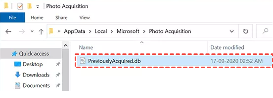 2. Accédez à C:\Users[nom d'utilisateur]\AppData\Local\Microsoft\Photo Acquisition, puis localisez le fichier nommé PreviouslyAcquired.db.