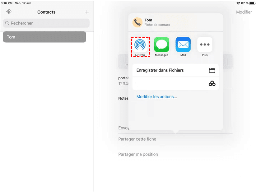 Étapes pour transférer des contacts ancien iPad ver le nouvel via AirDrop