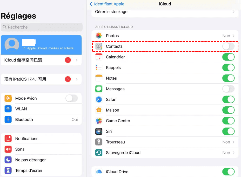Si deux iPads utilisent le même identifiant Apple, vous pouvez utiliser iCloud pour synchroniser les contacts d'un iPad à un autre. C'est un bon choix pour synchroniser tous les contacts sans fil. Cependant, veuillez noter qu'il n'y a que 5 Go d'espace de stockage gratuit. La synchronisation échouera s'il n'y a pas suffisamment d'espace.