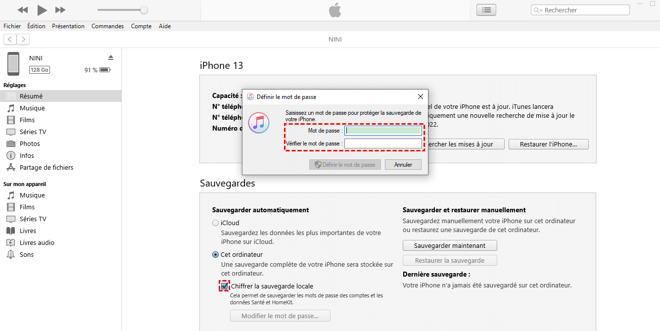 La sauvegarde iTunes n'est pas cryptée par défaut et une sauvegarde non cryptée ne couvre pas vos données de santé, mais vous pouvez activer manuellement le cryptage de la sauvegarde.