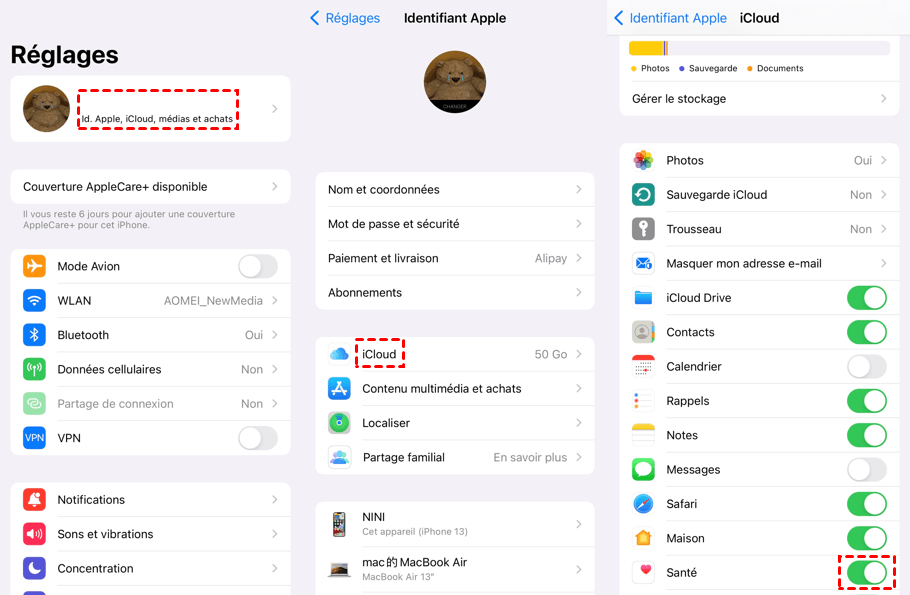 Tout d'abord, vérifiez si vous l'avez activé. Allez dans Réglages > Identifiant Apple > iCloud > vérifiez si l'option Santé est activée.