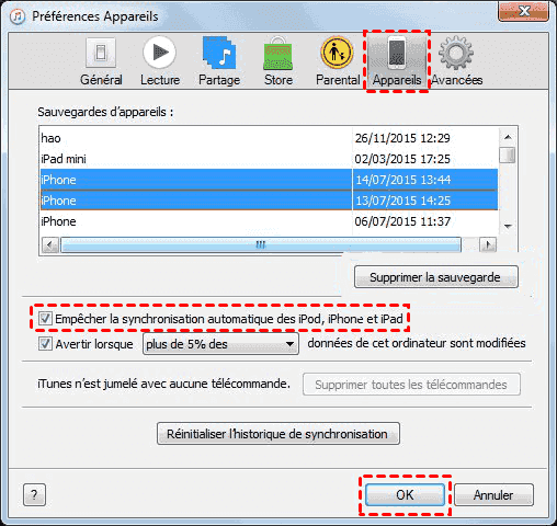 Par conséquent, si vous souhaitez synchroniser la musique achetée de l'iPod vers l'ordinateur, vous devez d'abord empêcher votre iPod de se synchroniser automatiquement. Allez dans Modifier > Préférences > Appareils. Suivez les étapes ci-dessous pour synchroniser la musique achetée de l'iPod Touch vers l'ordinateur.