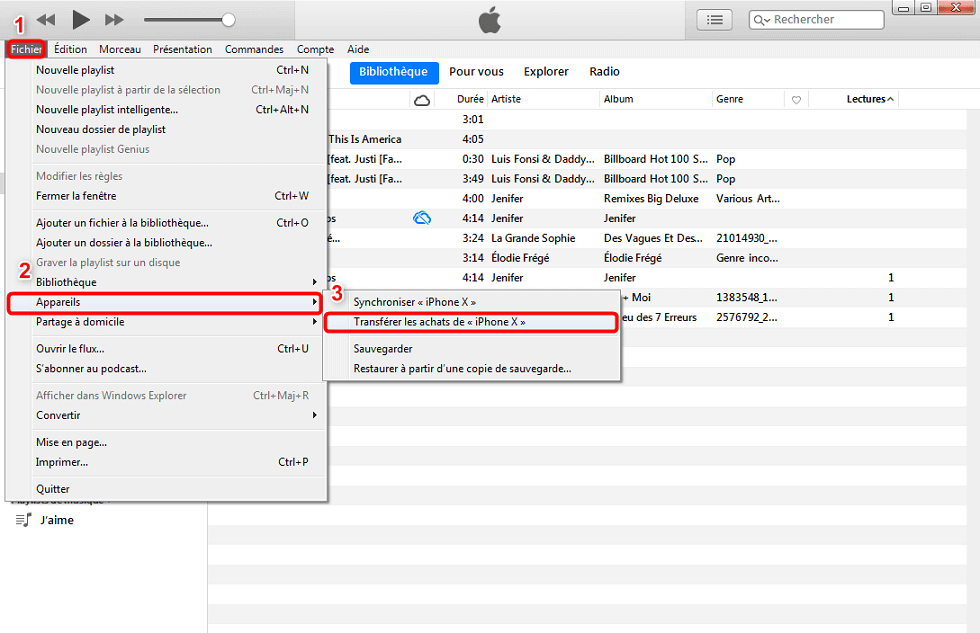 Étape 2. Cliquez sur Fichier > Appareils> Transférer les achats de [le nom de votre iPod] pour synchroniser la musique achetée dans la bibliothèque iTunes.