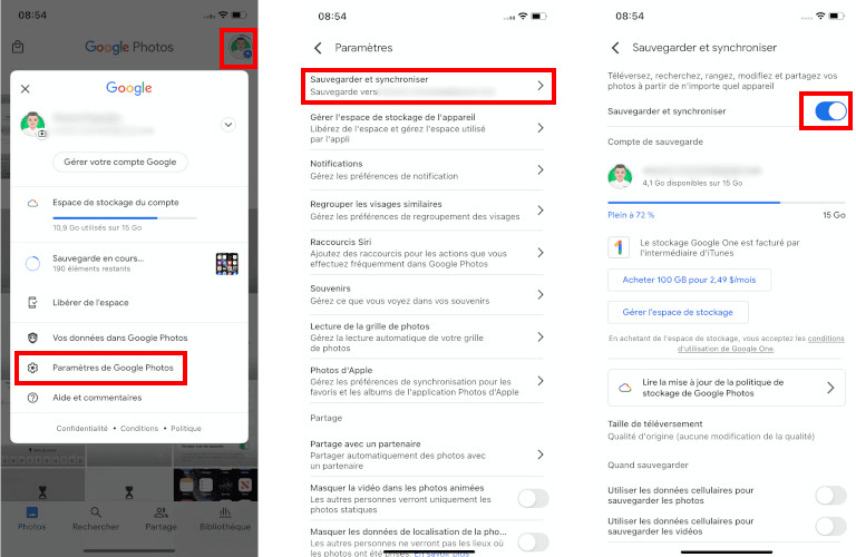 Étape 2. Ouvrez Google Photos sur un appareil Android > Connectez-vous avec votre compte Google > Appuyez sur Paramètres > Activer Sauvegarder et synchroniser, toutes les photos seront automatiquement synchronisées vers l'application.
