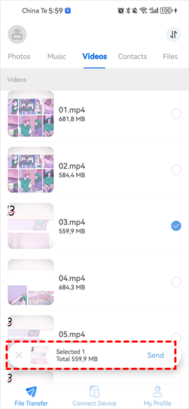 Étape 4. Sur votre téléphone Android, allez dans File Transfer > Cliquez sur Vidéos et choisissez les fichiers que vous souhaitez envoyer vers l'iPhone > Cliquez sur Send pour finaliser.