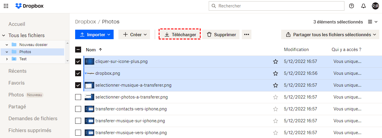 Étape 2 : Importer les éléments requis depuis votre appareil iOS vers Dropbox > Accédez à dropbox.com sur votre PC et repérez les fichiers récemment téléchargés.