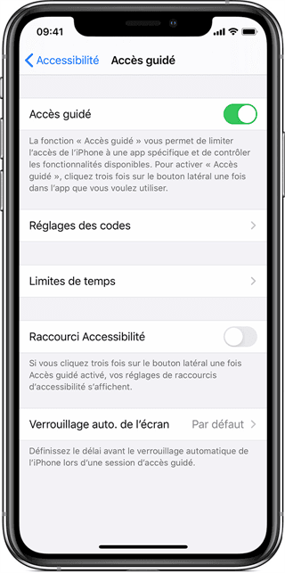 - Si vous avez défini le mode d'accès guidé, revenez dans Réglages → Accessibilité → Désactivez l'Accès guidé.