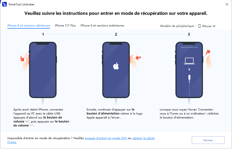 Étape 2. Mettez l’iPhone en mode Récupération :