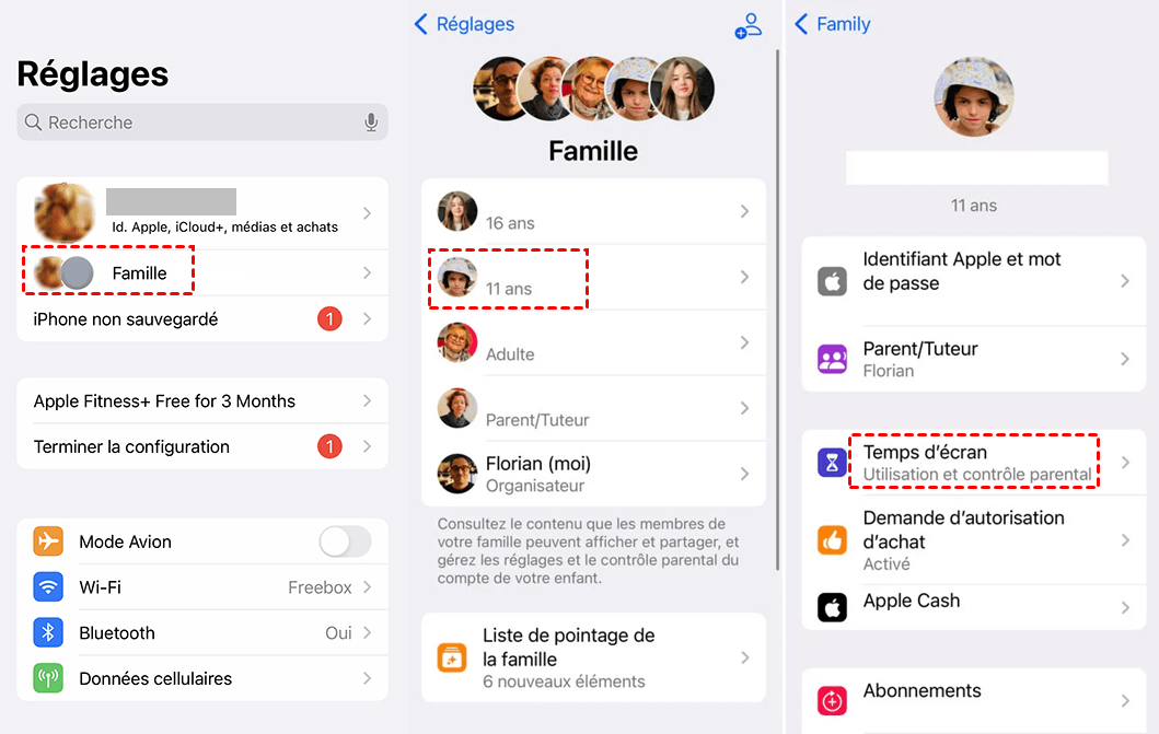 Étape 1. Ouvrez Réglages sur l’iPhone du parent, choisissez Famille, touchez le nom de l'enfant. Accéder à Temps d’écran.