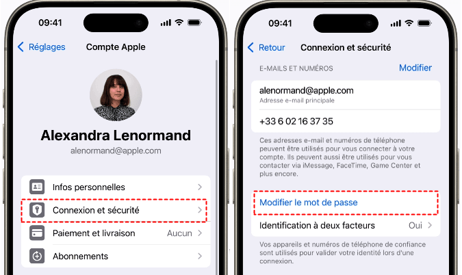 Si vous avez toujours accès à votre iPhone, la méthode la plus simple pour réinitialiser votre mot de passe est de passer par les Réglages. Apple propose une option intégrée qui vous permet de récupérer votre mot de passe en quelques étapes. Avez-vous oublié le mot de passe ID Apple et le code iPhone, de sorte que vous ne pouvez plus accéder à votre iPhone avec succès ? Si c'est le cas, vous pouvez aller directement à la solution 4 pour récupérer mot de passe ID Apple oublié sans code iPhone.