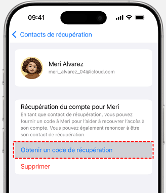 Si vous avez ajouté un contact de récupération de compte à votre Identifiant Apple, cette personne peut vous aider à retrouver l’accès à votre compte en vous fournissant un code de récupération.