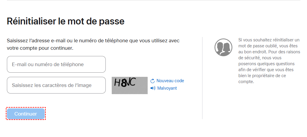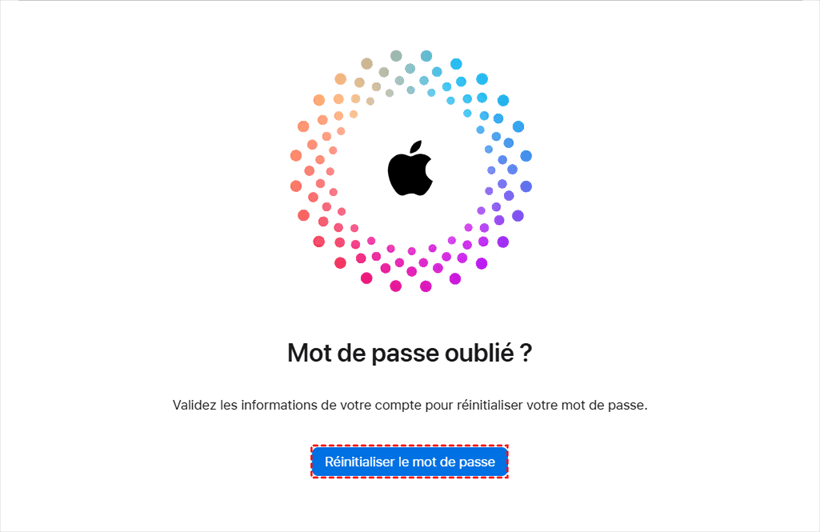 Étape 1. Allez sur iforgot.apple.com, un page officiel de réinitialisation du mot de passe, cliquez sur Réinitialiser le mot de passe pour commencer.