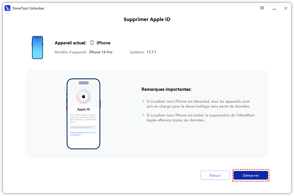 Si vous cherchez une méthode simple et efficace pour supprimer un identifiant Apple sans mot de passe, FoneTool Unlocker est une excellente solution. Cet outil de déverrouillage des appareils iOS professionnel vous permet de supprimer un compte Apple en quelques clics, même si vous avez oublié mot de passe identifiant Apple.