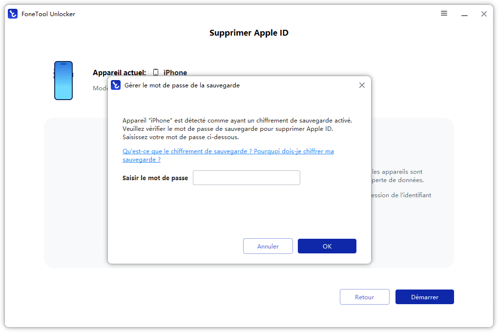 Étape 3. Si vous avez défini un mot de passe de sauvegarde pour l'iPhone, entrez-le et cliquez sur OK.