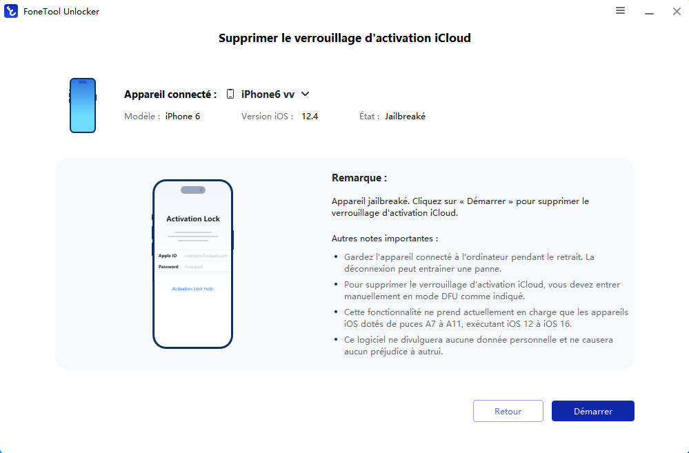 Avant de supprimer le verrouillage d'activation iCloud avec FoneTool Unlocker, jailbreakez votre appareil iOS sur votre ordinateur. Veuillez consulter ce lien.