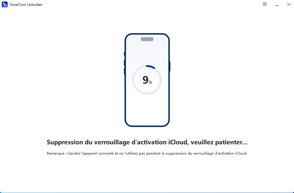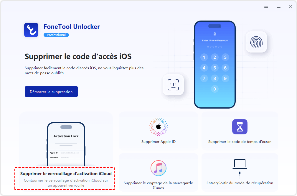 1. Lancez FoneTool Unlocker, connectez votre appareil iOS jailbreaké à l'ordinateur à l'aide d'un câble de données, puis cliquez sur « Supprimer le verrouillage d'activation iCloud ».