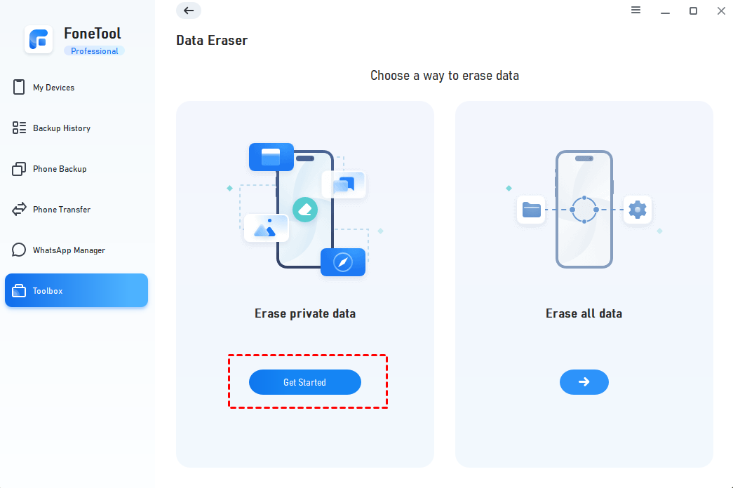 Step 1.Launch FoneTool, click the "Toolbox" button in the Left-Navigation-Bar, Choose the "Data Eraser".
