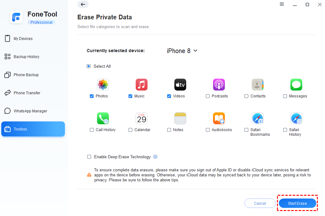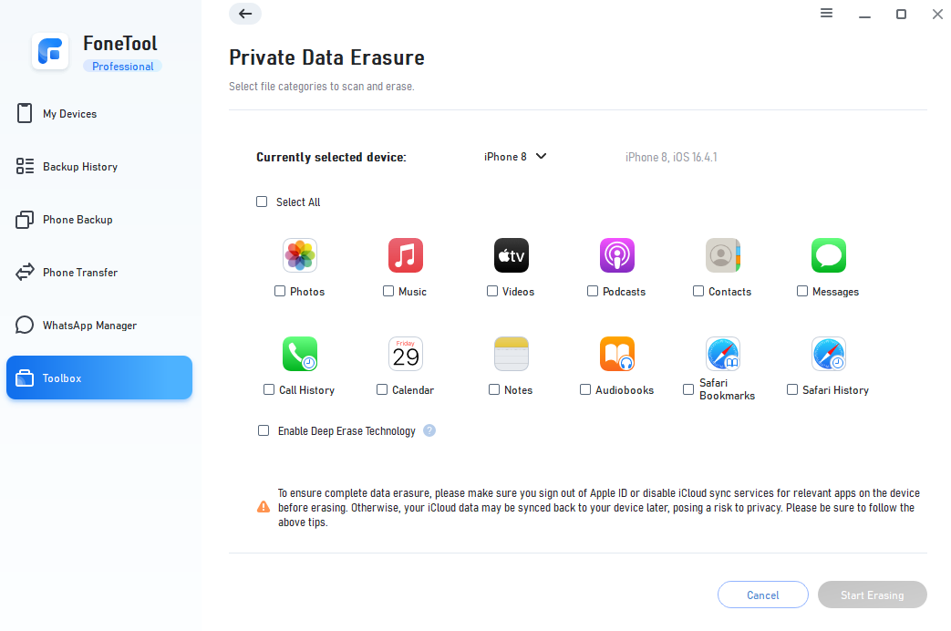 While FoneTool provides you with the service of backing up and transferring iOS device data, it also provides you with the service of completely erasing iOS data, ensuring your data privacy and security to a great extent. We have provided you with two erasing features. You can use the "Erase All Data" feature to erase the entire device at once, or selectively erase the data you wish to clear for privacy using the "Erase Private Data" option.
