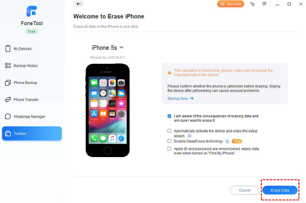 Enable Deep Erase technology: If you don’t tick the option, FoneTool will restore iPhone to factory settings, but there is no guarantee that the data will not be restored. If you tick the option, FoneTool will erase deeply, overwrite and erase the data multiple times to ensure that the privacy files in iPhone are not at risk of being restored. Please note that this option is available in the professional edition only. If you are using the free edition, you need to upgrade to Pro edition.