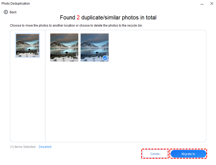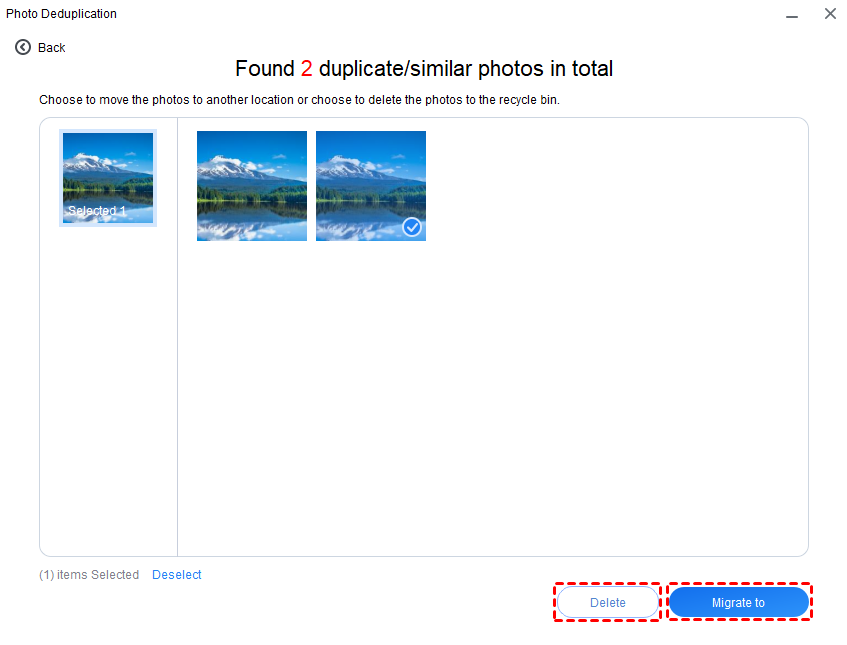 Step 4: On the matching result page, select the photos. If you click the "Delete" button, the selected photos will be moved to the “DeletePhoto xxx” folder in Recycle Bin. If you click the "Migrate to" button, the selected photos will be moved from the original location to the designated computer path.