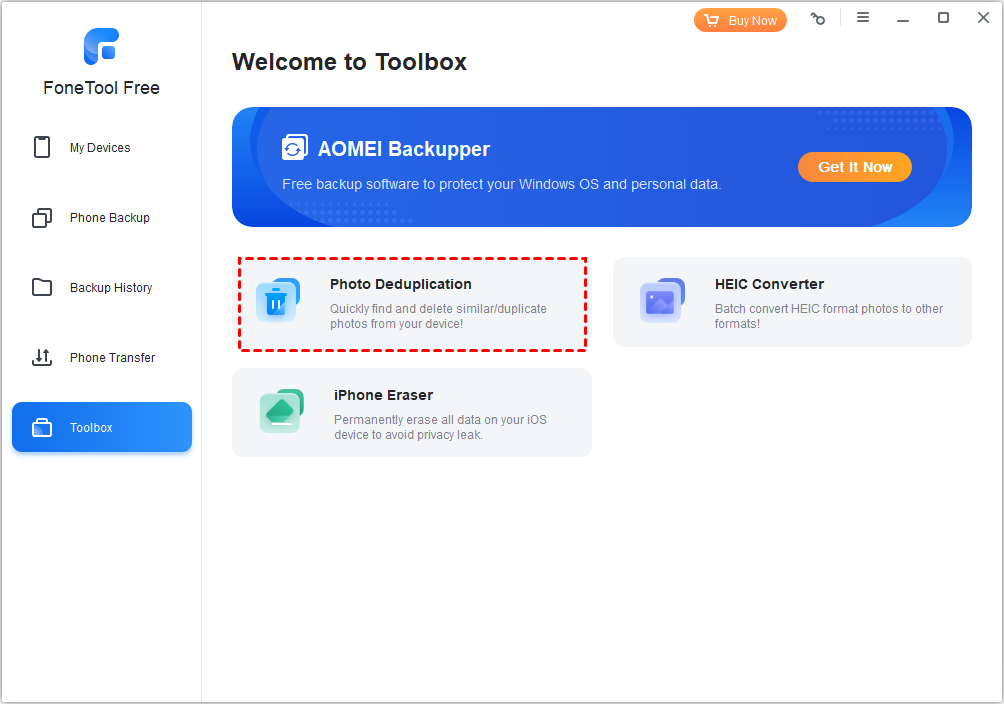 Step 1: Click the "Photo Deduplication" function in the Tools bar in FoneTool Home interface.