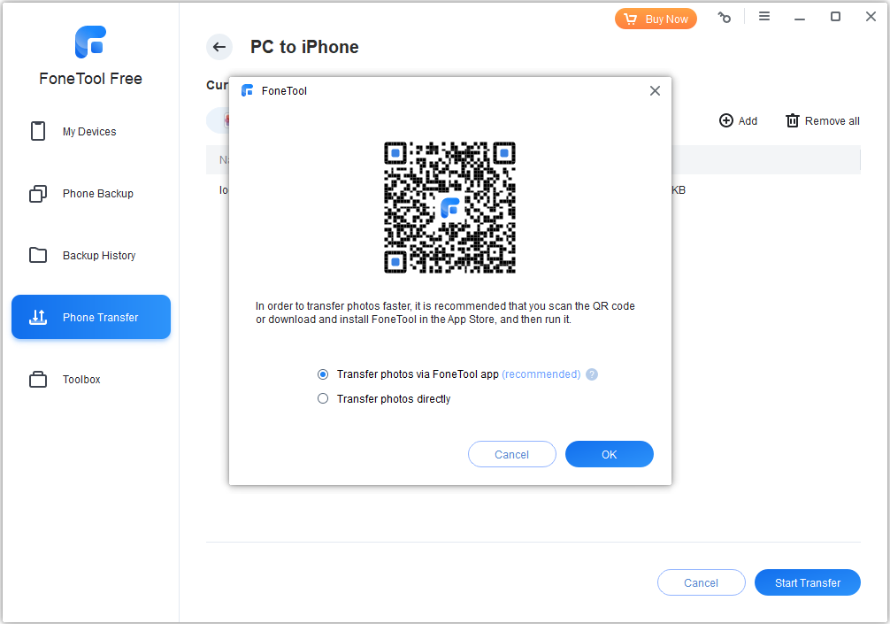 FoneTool offers two ways to transfer photos to your iPhone: the first way is to transfer photos from your PC to your iPhone with the help of the FoneTool App, after the transfer is complete, these photos can be deleted and edited on your iPhone. The second way is to transfer photos directly to your iPhone, this way does not require the installation of FoneTool App, but the photos cannot be deleted or edited on your iPhone. The second method is similar to the iTunes "Sync Photos" function. If you have used this function, you will find that the photos synced to iPhone by iTunes cannot be deleted or edited on your phone either.