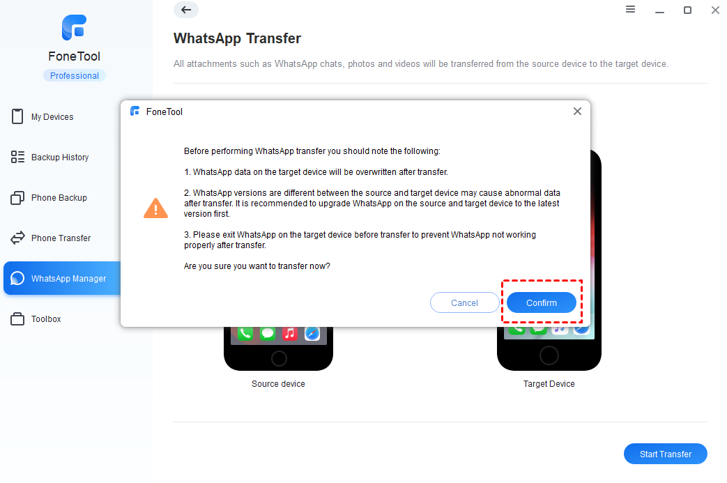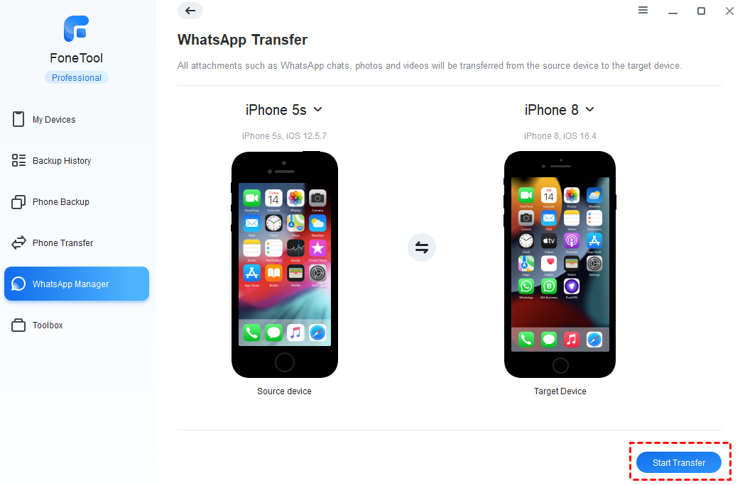 The transfer process is straightforward, and FoneTool makes it easy to transfer your WhatsApp data with just a few clicks.