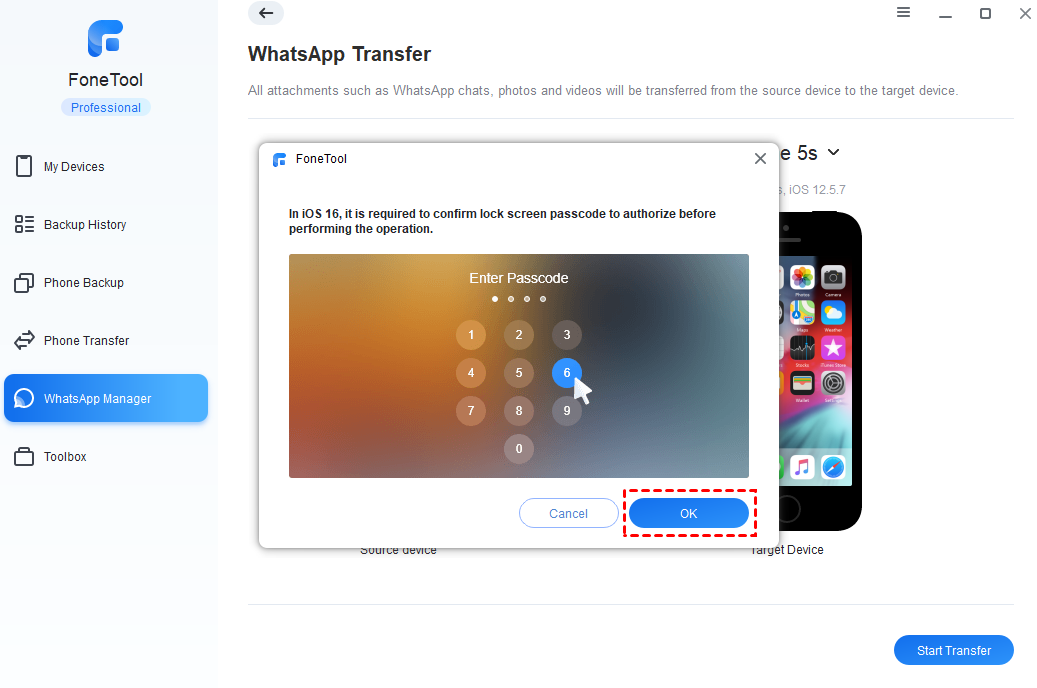 So, if your iOS version is 16 or later, please click "OK" and then enter the passcode on source iso device to start the transfer.