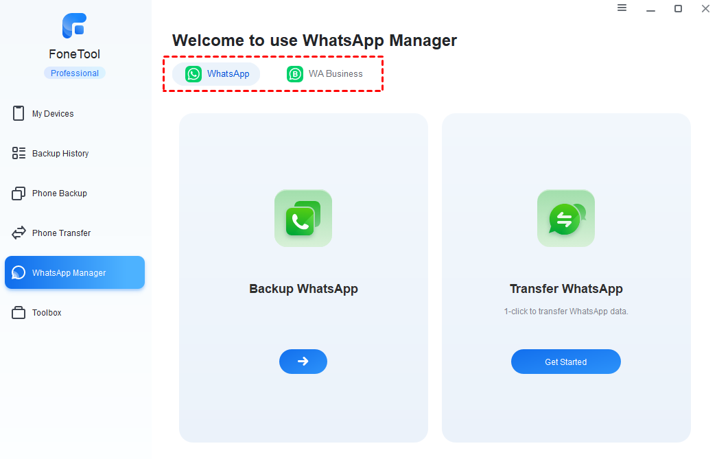 1. Launch FoneTool, then click "WhatsApp Manager" on the left menu bar.