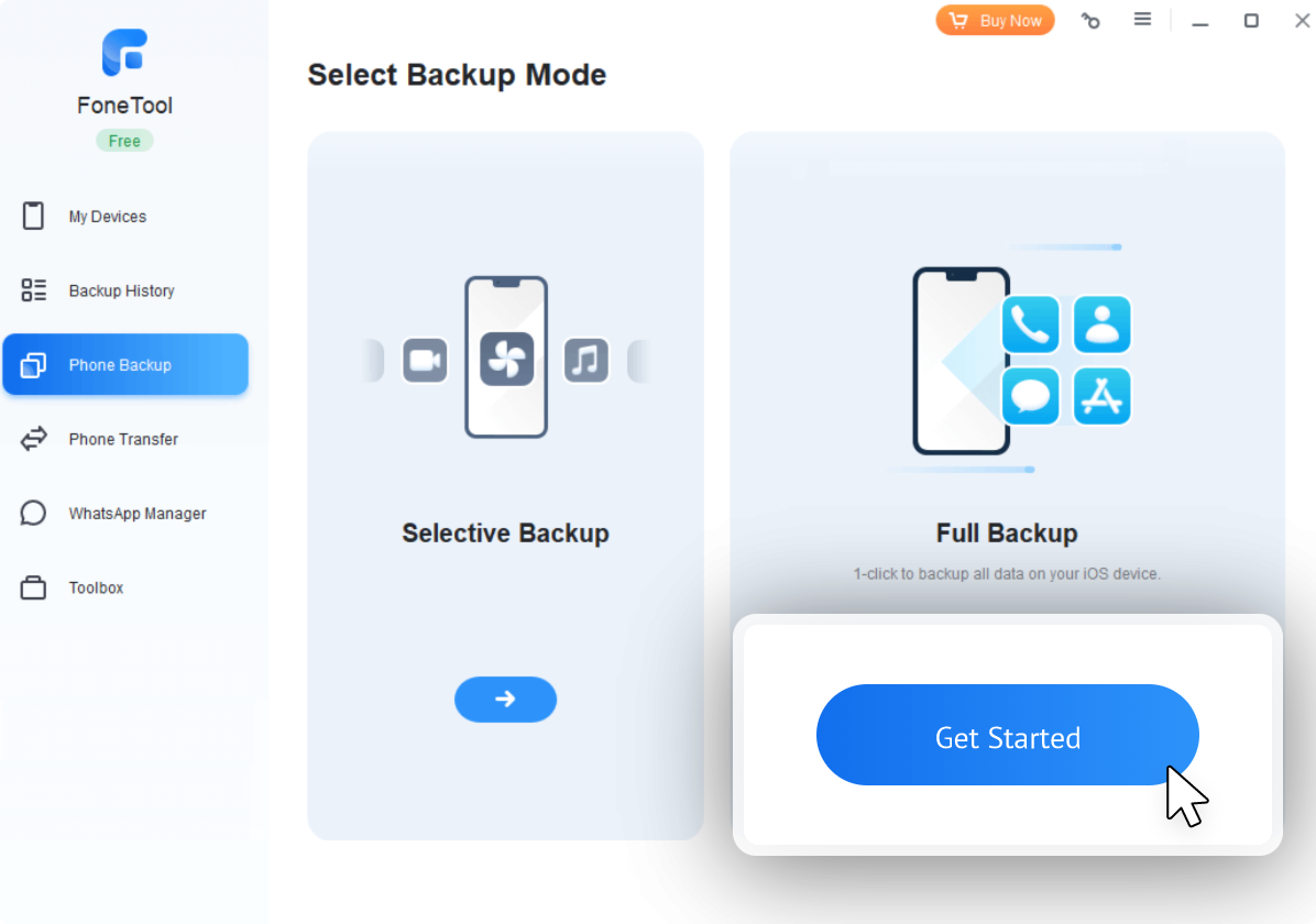 Open the FoneTool, click Phone Backup -> Selective Backup -> Get Started.