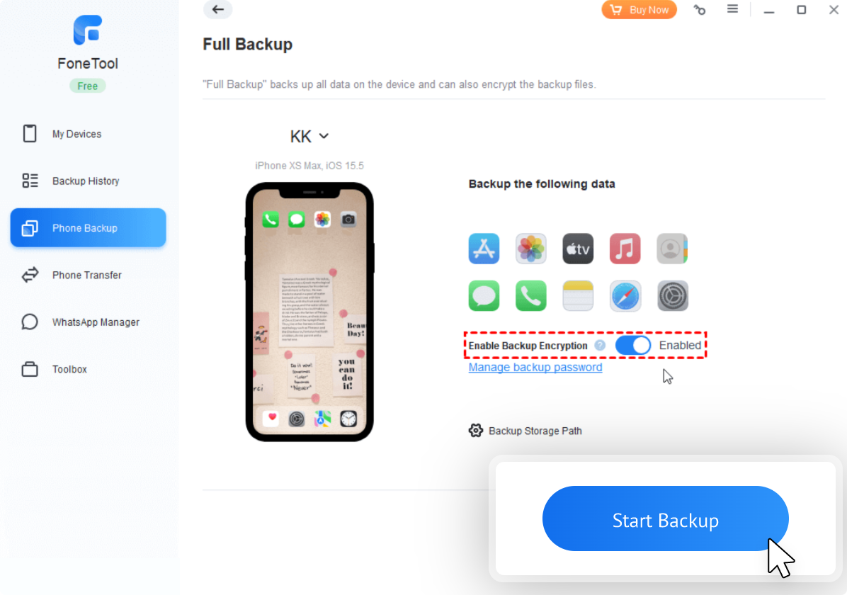 Choose whether to Enable Backup Encryption, click Backup Storage Path to change the data backup destination, and tap Start Backup.