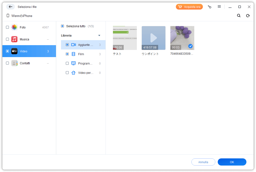 3. Fai clic sull'icona "+" > Scegli i video che desideri trasferire sul computer > Fai clic su OK per continuare.