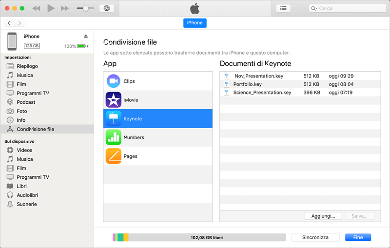 ✍Nota: questo metodo può essere utilizzato per trasferire documenti creati da Keynote, Numbers, Pages o altre app che funzionano con la condivisione file.
