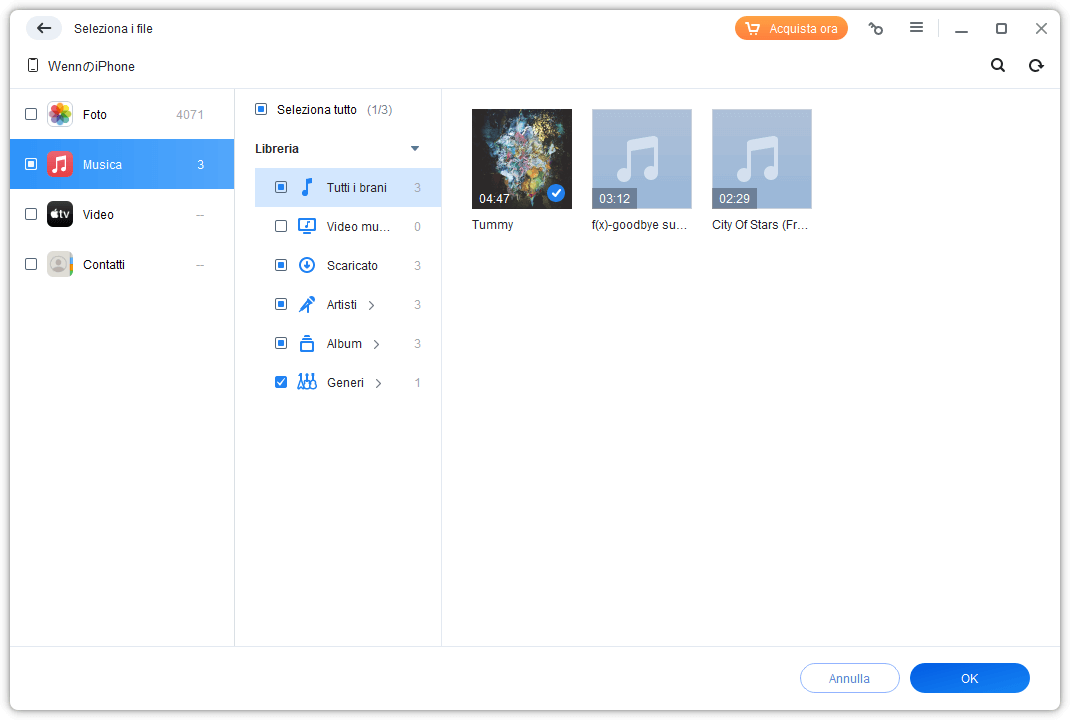 Passaggio 3. Fai clic su Musica per scegliere i brani che desideri trasferire su un altro ID Apple > Fai clic su OK per continuare.