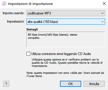 5. Selezionare la casella accanto a Usa correzione errori durante la lettura di CD audio > Fare clic su OK per confermare e attendere che la musica del CD venga importata nella libreria di iTunes.