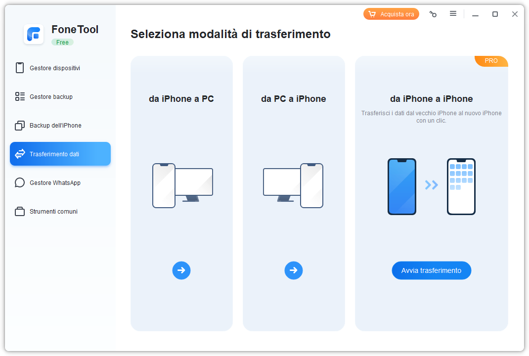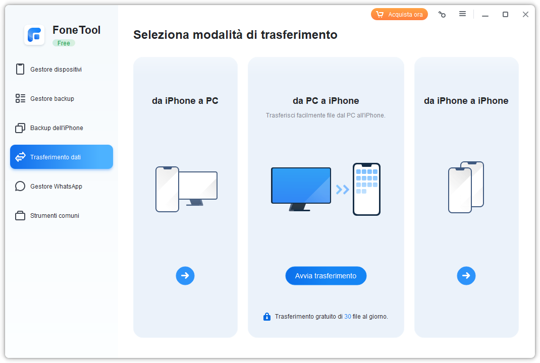 Fornisce due metodi di trasferimento. Puoi trasferire tutti i dati con un clic oppure puoi trasferire selettivamente i dati di cui hai bisogno. Per prima cosa scarica FoneTool e segui i passaggi seguenti per sapere come trasferire sul nuovo iPhone.
