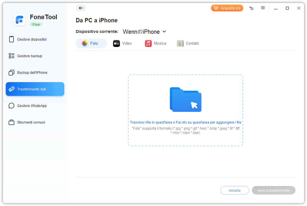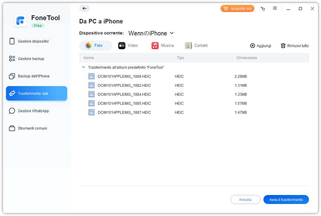 Se desideri trasferire i dati sul nuovo iPhone da Android dopo la configurazione, puoi prima esportare i file Android sul computer e poi aggiungere i dati su iPhone tramite la funzione Trasferisci su iPhone.