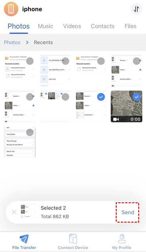 - Consenti a FoneTool di accedere a foto, musica, video, contatti, ecc. Seleziona i file che desideri trasferire e tocca Invia. Puoi andare all'elenco dei trasferimenti per verificare il processo.