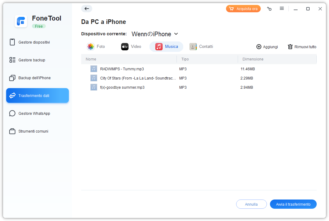 Questo è tutto ciò che c'è da sapere su come trasferire musica da Windows 11/10 a iPhone. Tra i tre metodi descritti, FoneTool si distingue per essere il più semplice e pratico. Questo strumento ti permette di importare facilmente sia brani acquistati che non acquistati dal tuo PC all’iPhone, senza rischiare di cancellare la musica o altri dati già presenti sul dispositivo. A differenza di iTunes, che può sincronizzare solo determinate librerie e potrebbe eliminare file esistenti, FoneTool garantisce un trasferimento sicuro senza intaccare i dati già presenti.