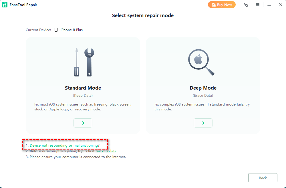 Passaggio 1. Clicca su Inizia riparazione nella schermata principale e seleziona il testo Dispositivo non risponde o non funziona correttamente.