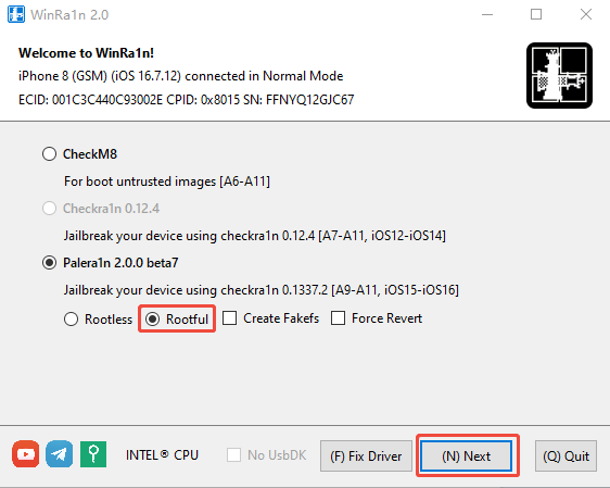 2. Seleziona Palera1n 2.0.0 beta7, scegli Rootful e seleziona Crea FakeFS. Fai clic su Avanti.